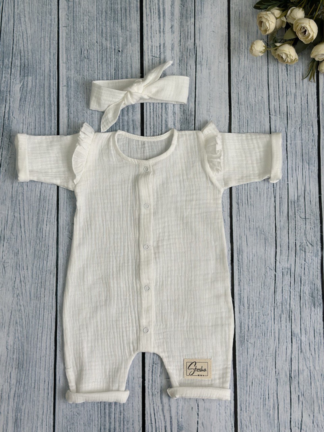 Теги: Купить оптом детский комбинезон . 336-МО. Комбинезон с повязкой для девочки из муслина, хлопок 100%, размеры 56,62,68, молочный цена,отзывы официальный сайт "Стеша Балашиха"