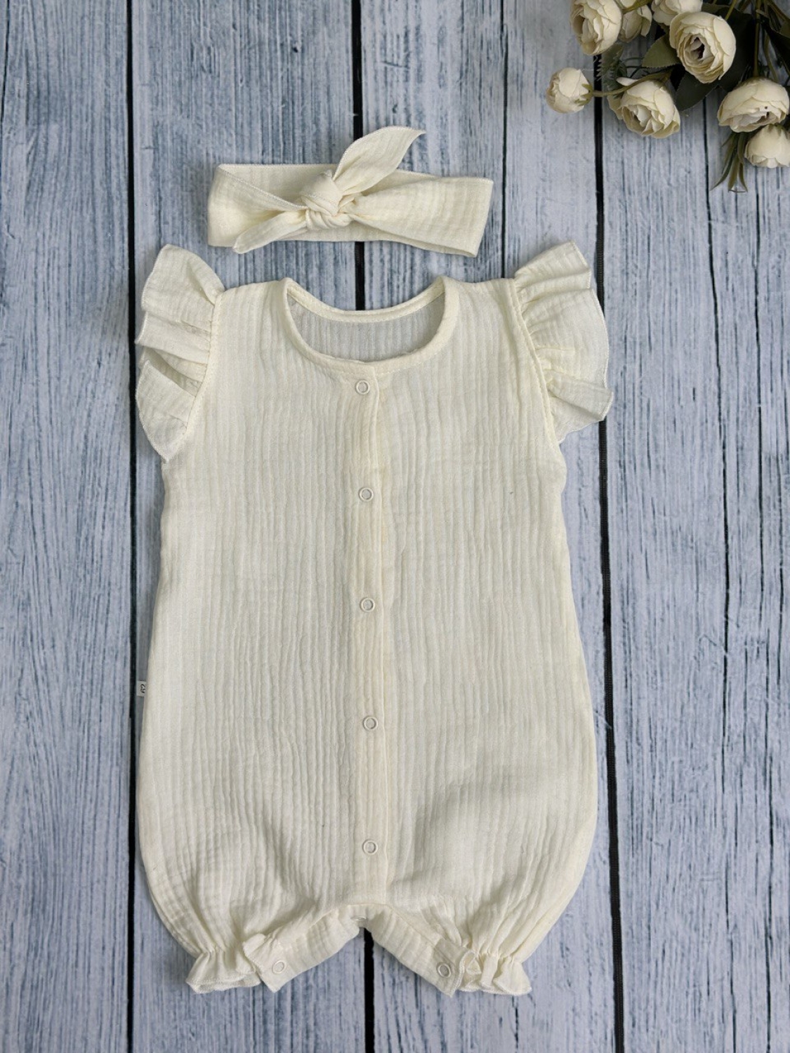 341-СЛ. Песочник с повязкой для девочки из муслина, хлопок 100%, р 62,68,74,80 сливочный