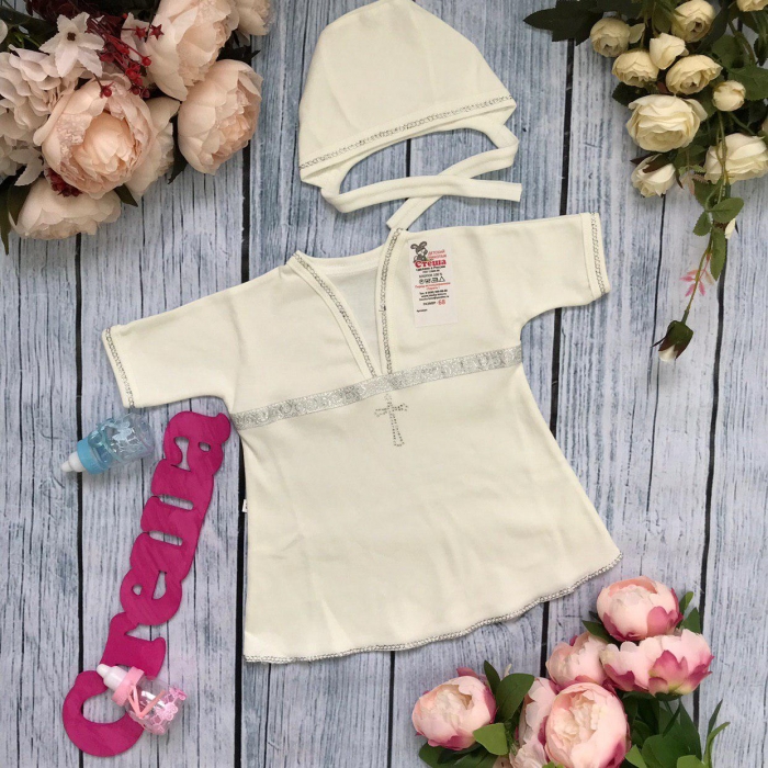Теги: Купить оптом крестильную рубашку. 169. Крестильная рубашка с чепчиком (серебро), хлопок 100 % интерлок 62,68,74,80 цена,отзывы официальный сайт "Стеша Балашиха"